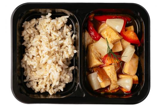 Куриное бедро в кисло-сладком соусе с ананасом. Рис