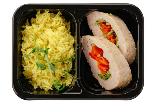 Рулет куриный с брокколи и перцем. Рис отварной.